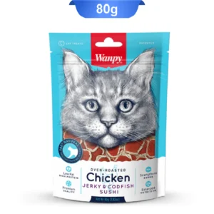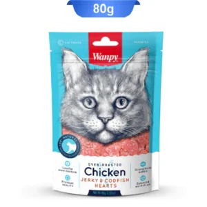 تشویقی گربه ونپی طعم مرغ و ماهی کاد قلبی وزن 80 گرم Wanpy Chicken Jerky & Codfish Hearts
