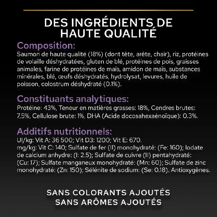 مغز و چشمها در دوران رشد بیشترین نیاز را به اسیدهای چرب امگا ۳ دارند. وجود DHA (مشتق طبیعی از روغن ماهی و شیر مادر) در این محصول، به توسعه شناختی و بینایی گربه کمک مینماید.