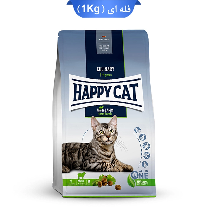 غذای خشک گربه بالغ کولیناری سوپر پرمیوم (زیپ کیپ فله ای) طعم بره هپی کت (Lamm) وزن 1 کیلوگرم
