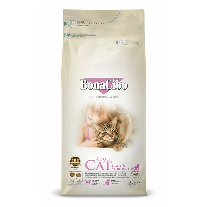 غذای خشک گربه های بالغ عقیم شده دارای اضافه وزن بوناسیبو که حاوی پروتئین و چربی مناسب به منظور تامین انرژی و کنترل وزن ایده آل به روشی خاص که تمام مواد مغذی ضروری را در یک غذای