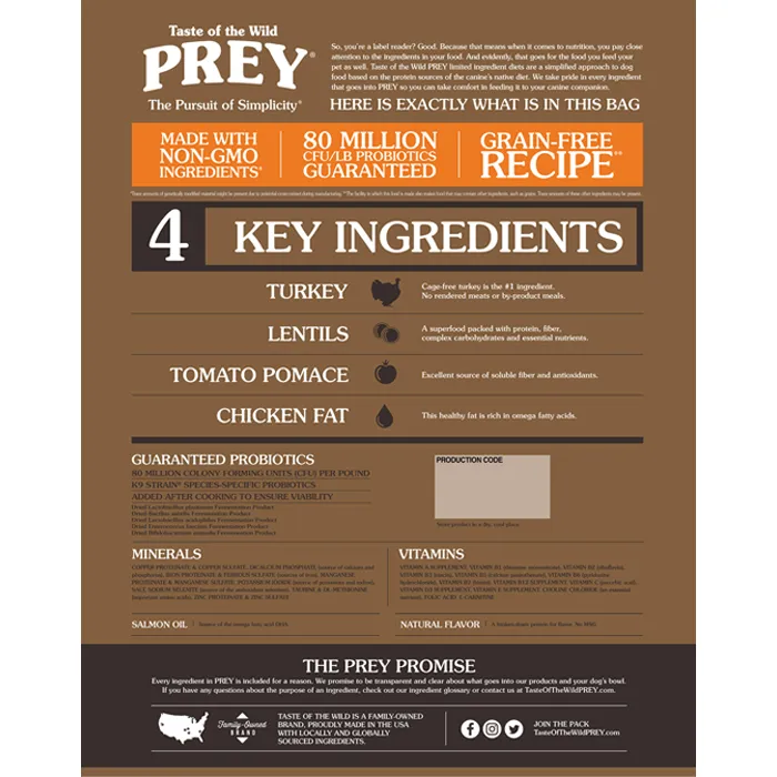 غذا خشک سگ بالغ پری تیست آف د وایلد طعم بوقلمون با تکیه بر اینکه یک رژیم غذایی ساده و با مواد محدود فواید زیادی دارد پیش رفته است و تمامی نیاز هایی که یک سگ در طول حیاتش به ان احتیاج دارد را برای او فراهم کرده است.