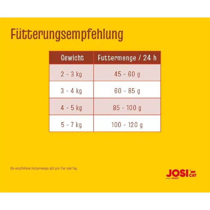 جوسی کت طعم گوشت یک وعده غذایی لذیذ و کامل برای گربه شماست! با ترکیبی از پروتئین باکیفیت اردک، ویتامین‌های ضروری و فیبرهای مفید، این غذا نه‌تنها هضم آسانی دارد، بلکه به سلامت پوست، مو و سیستم ایمنی گربه شما کمک می‌کند. در جدول زیر مقادیر مصرف این غذا خشک جوسرا آورده شده است :