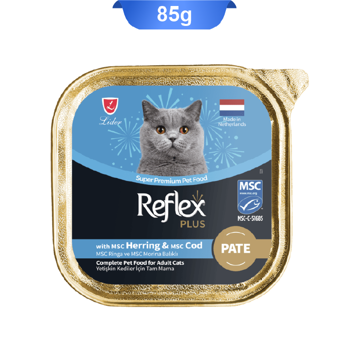 ووم گربه بالغ رفلکس پته طعم شاه ماهی و ماهی کاد وزن 85 گرم Reflex Plus With Msc Herring & Msc Cod