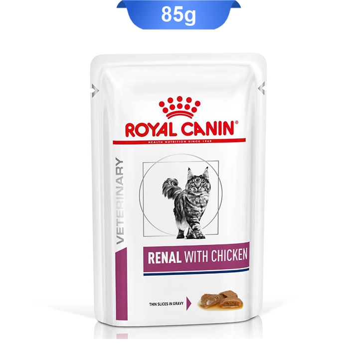 پوچ گربه رویال کنین مدل renal با طعم مرغ برای کمک به مدیریت بیماری مزمن کلیه در گربه ها طراحی شده است. همچنین ممکن است در پیشگیری از سنگهای مثانه اورات و سیستین استفاده شود.