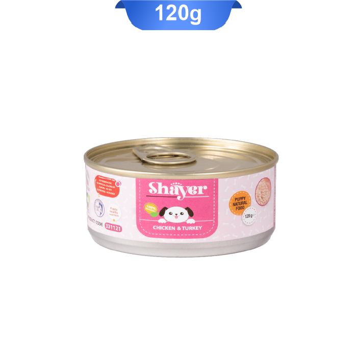 کنسرو توله سگ پاپی طعم مرغ و بوقلمون شایر مدل نچرال وزن 120 گرم Shayer