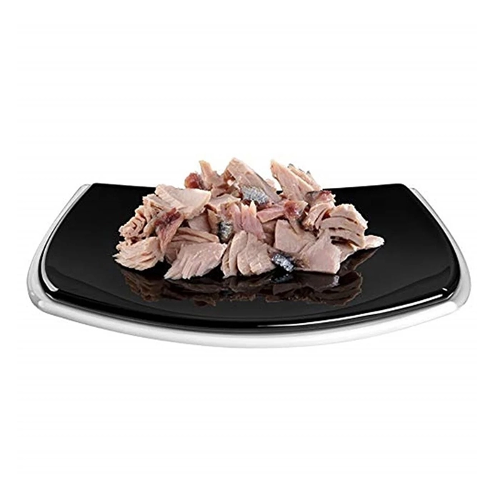 این کنسرو با تکه های فیله ماهی تن و تکه های ماهی آنچوی در آب ماهی تازه با عطری بی نظیر هر گربه ی بدغذا را به اشتها می آورد.