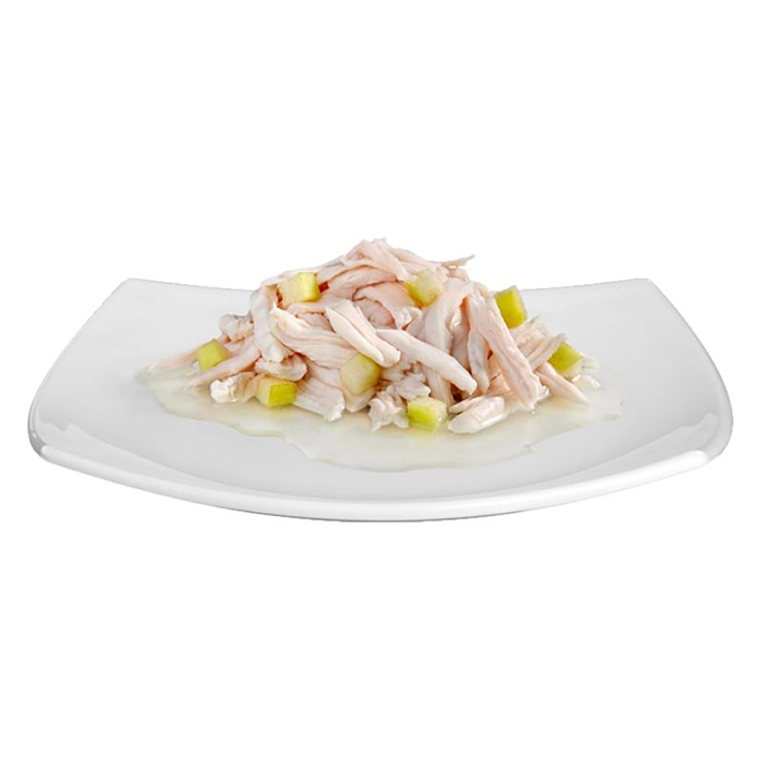 این کنسرو با تکه های فیله مرغ ترد و تکه های سیب سبز که به آرامی پخته شده اند در آب گوشت تازه با عطری بی نظیر هر گربه ی بدغذا را به اشتها می آورد.