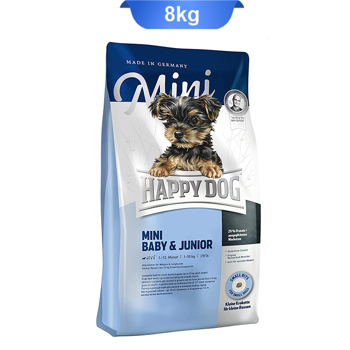 غذای خشک توله سگ های نژاد کوچک حساس (1 تا 12 ماه) برای بهبود رشد هپی داگ Mini Baby & Junior یک غذای کامل بدون گلوتن برای توله سگ ها و سگ های جوان نژادهای کوچک است.