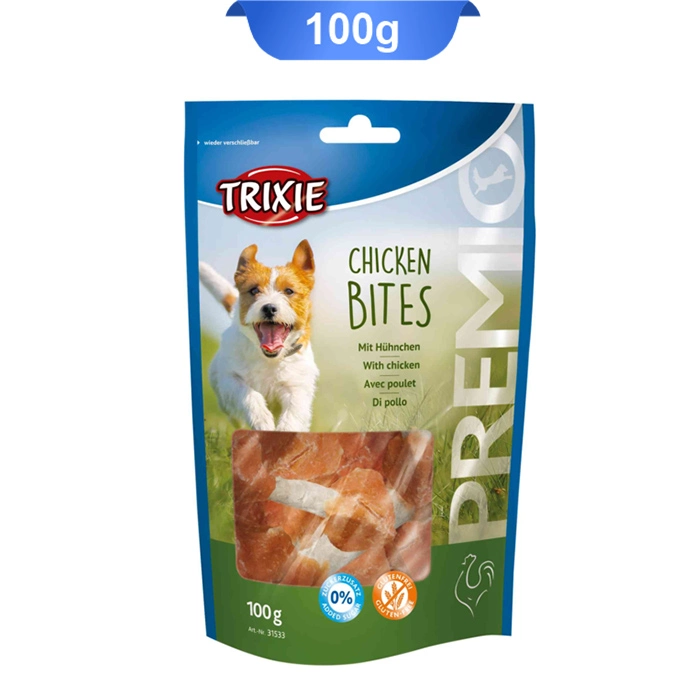 تشویقی سگ از پوست گاو و مرغ مدل دمبلی برای بهبود سلامتی دندان ها تریکسی (Chicken Bites) وزن 100 گرم