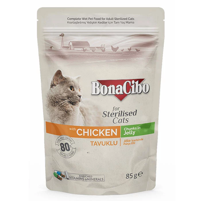 پوچ گربه بالغ عقیم شده بوناسیبو طعم مرغ در ژله (Sterilised) یک غذای مرطوب مخلوط در ژله می باشد که طعمی لذیذ و خوشایندی دارد که از گوشت و محصولات غنی شده حیوانی که سرشار از ویتامین ها ، مواد معدنی مغذی وکاملا