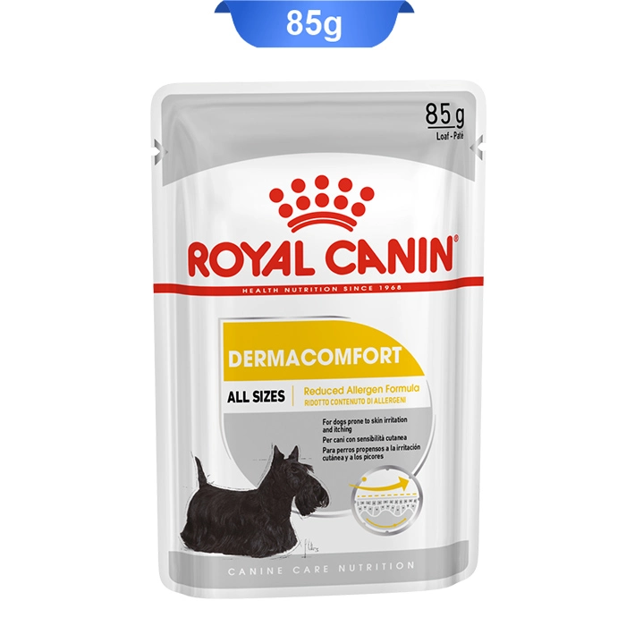 پوچ سگ های بالغ نژادهای کوچک با پوست حساس رویال کنین (Dermacomfort) وزن85 گرم
